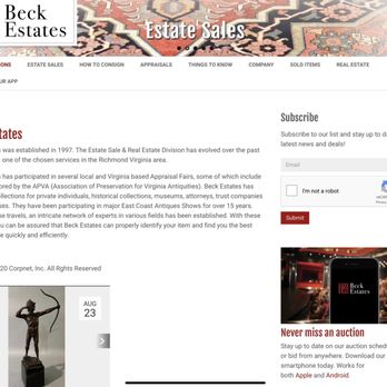 View information about this sale in Richmond VA. Beck Estates LLC is an estate sale company located in RichmondVirginiaBeck Estates LLC features professionally conducted estate sales and liquidations. What truly makes Beck Auctions the greatest Auction house in Alberta is our incredible team.